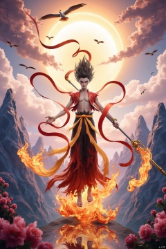 Nezha stands majestically amidst a whimsical fairyland, floating mountains and exotic flowers swirling around him like ethereal clouds. A symphony of auspicious elements converges: cranes soar through the sky, while wind fire wheels spin slowly beneath his feet, flames dancing softly yet majestically. Elegant armor glistens as he holds a fire-tinged spear and chaos ribbon, exuding tranquility and sacredness.
