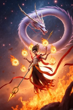 Nezha's majestic dance unfolds against a celestial canvas of twinkling stars, as he stands amidst the wispy tendrils of ethereal light. A colossal dragon, its scales glinting like polished armor, provides a stunning backdrop for Nezha's fiery display. He wears dragon scale armor that mirrors the beast's scales, while holding aloft a spear ablaze with fire and universe circle. Windfire wheels spin wildly, their flames illuminating Nezha's triumphant form - his three-headed and six-armed physique radiates mythic grandeur as he dances amidst the starry expanse.