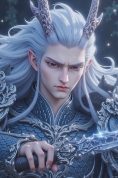 solo, long hair, red eyes, 1boy, weapon, white hair, male focus, horns, teeth, pointy ears, sword, armor, fangs, dragon