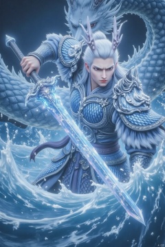 solo, 1boy, weapon, white hair, male focus, boots, horns, sword, water, armor, holding sword, dragon