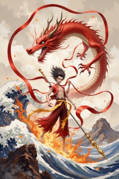 solo, 1boy, weapon, male focus, water, fire, polearm, spear, dragon, waves, eastern dragon,nezha,