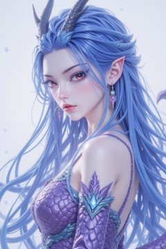 1girl, solo, long hair, breasts, looking at viewer, red eyes, dress, bare shoulders, jewelry, medium breasts, closed mouth, blue hair, tail, upper body, earrings, horns, pointy ears, from side, eyelashes, makeup, dragon horns, dragon girl, backless outfit, scales
