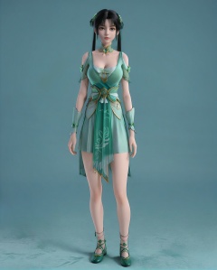 air_skin,white_skin,score_9,<lora:SF_BiYao_Pony_Realism-000004:0.7>,green dress,hair ornament,black hair,1girl,breasts,large breasts,standing,solo,green footwear,looking at viewer,simple background,full body,