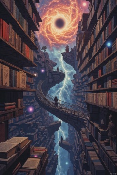 "An infinite library of bookshelves floats in the cosmic void. Pages flip automatically, releasing three-dimensional holographic histories of civilizations. Ink forms nebula-like creatures in zero gravity, and spectral librarians wander through the maze of shelves. At the center, a black hole composed of forbidden book seals hovers."