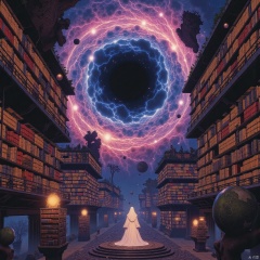 "An infinite library of bookshelves floats in the cosmic void. Pages flip automatically, releasing three-dimensional holographic histories of civilizations. Ink forms nebula-like creatures in zero gravity, and spectral librarians wander through the maze of shelves. At the center, a black hole composed of forbidden book seals hovers."
