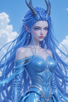 1girl, solo, long hair, blue eyes, bare shoulders, jewelry, very long hair, blue hair, standing, full body, outdoors, horns, sky, day, cloud, blue sky, wavy hair, monster girl, riding, taur