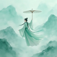 It presents a surreal, ethereal scene of a lone female figure in a flowing green traditional Chinese robe, floating elegantly against a background of hazy, ethereal turquoise tones. Her long black hair was tied in intricate braids, and she seemed to float in the air, with an outstretched hand holding a large translucent white umbrella, a symbol of protection and serenity. The misty and ethereal background consists of hazy mountains, wisps of white clouds and a surreal, otherworldly feeling that suggests a dreamlike state. The color is dominated by cool colors, with shades of blue, green and white, creating a peaceful and mysterious atmosphere. The overall texture is smooth, the brushstrokes are delicate, and the watercolor-like texture enhances the dreamy mood of the work. The image is a digital painting with a modern yet traditional artistic style that combines elements of Chinese culture with a dreamlike fantasy environment.