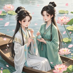 in a digital drawing style. This vibrant digital illustration depicts two young Asian women in a serene, traditional setting. The woman on the left is seated on a wooden boat, dressed in a flowing, white silk kimono with intricate, pale blue and gold accents. Her long, dark hair is styled in elegant braids adorned with silver hairpins. She holds a delicate teacup in her hands, sipping from it with a serene expression, and her eyes are focused forward. The woman on the right stands beside her, also wearing a traditional, green silk kimono with similar gold and blue accents. Her hair is styled similarly, with braids adorned with silver hairpins. She holds a small teapot, carefully pouring tea into the woman's cup. Both women have fair complexions and large, expressive eyes. The background features a tranquil lake with pink lotus flowers, their petals open and vibrant. Soft, pastel-colored petals float gently around the boat, adding a dreamlike quality to the scene. The overall atmosphere is serene, peaceful, and timeless, evoking a sense of calm and connection between the two women.