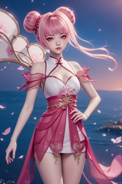1girl, solo, looking at viewer, bangs, dress, pink hair, hair bun, double bun, chinese clothes, pink dress,masterpiece,best quality,official art,extremely detailed CG unity 8k wallpaper,,,Above the waist,Thigh exposed,