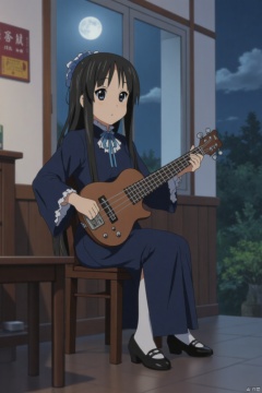 best quality, masterpiece, ultra-detailed, anime), 1girl, black hair, blue eyes, shy, gentle, bassist, traditional Chinese cheongsam, dark blue silk, white lace collar and cuffs, silver moon and cloud embroidery, slit skirt, white stockings, black Mary Jane shoes, double ponytails with blue ribbon bows, sitting by the window in a music classroom, holding a bass, looking at the full moon, gentle smile, moonlight streaming through the window, posters of the light music club on the wall, Mid-Autumn Festival, school, night