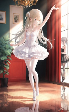 asterpiece,best quality,high quality,loli,overexposure,chromatic_aberration,light,fair_skin, //, multiple girls, 2girls, ballerina, dancing, ballet, ballet slippers, curtains, indoors, blonde hair, window, tiptoes, plant, tutu, potted plant, leotard peek, leotard, pantyhose, reflection, grey hair, long hair, standing on one leg, standing, breasts, plantar flexion, reflective floor, balancing, wooden floor, sunlight, arm up, day, white leotard, chandelier, thighhighs, bare shoulders, strapless, leg up, dress, //, very aesthetic,absurdres,newest,masterpiece,safe,amazing quality,(nasii:0.4),(toosaka asagi:0.4),(atdan:0.4),(iumu:0.72),(wlop:0.72),96YOTTEA,Konya Karasue,omone_hokoma_agm, //, official art,depth of field,detailed light,blurry background,best shadow,shiny skin,cinematic lighting,ray tracing, amazing quality,very aesthetic,absurdres,beast quality,ultra detailed,newest,8K,HDR,