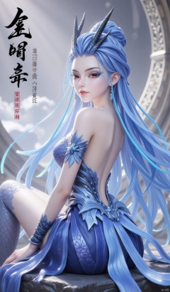 1girl,Long light blue hair,Blue eye shadow,Dragon horn,Red eye,Earrings,Eyelashes,Scales,1girl, solo, breasts, looking at viewer, black hair, hair ornament, jewelry, sitting, looking back, hair bun, bracelet, sideboob, back,, armlet, backless outfit, realistic, chinese text, bare back