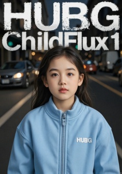 A medium shot of a girl in a light blue jacket. The jacket has a zipper on the front and a white HUBG logo on the right side. The girl has dark brown hair and blue eyes. She is standing in front of a backdrop of a city street. There are cars driving on the street. The background is dark and blurred. The word "HUBG ChildFlux.1" is written in bold white letters at the top of the image.