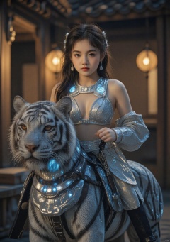 kodak film\(hubgstyle)\,Topic: Female warriors in a light armor Revealing smooth skin Deep grooving set Big chest emphasizes elegance and sexy. Riding a giant blue tiger A fierce red eyes Tiger wearing heavy steel armor patterns, glowing energy patterns The background is an ancient Chinese temple with warm lamps. Material: A realistic photo level 6K, Ultra Photrealistic CGI Style: realistic, fantasy, Hollywood movie Artist: Inspired by Raphael Lacoste and Furio Tdeschi Influence from the website: high quality Artstation and Unreal Engine 5 Render Sharp: Maximum details See realistic skin surfaces Clear armor patterns All fine tigers More details: The expression of the face of a female warrior is confident. Elegant Smooth skin The surface of materials such as metal, fur and skin is highly resolution. Shadow and color: realistic color tones, emphasizing the blue blue color of the tiger Contrasting with warm light from the lamp Giving a magical and powerful feeling Light and brightness: shadow light according to the principles The source of light from Chinese lamps give a mysterious atmosphere. Reflective light on metal and skin looks realistic. Prohibition: Cartoon style, drawing, low resolution, distorted proportion, plastic surface, unrealistic effects,