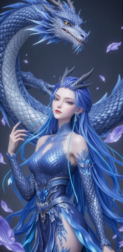 1 girl,solo,full body,Blue hair,long hair,Gaze down,One's mouth turns upward,Exaggerated nail length,Blue with colored nails,Confident look,Blue-purple eyeshadow,dragon scales,Off-the-shoulder dress,A dragon hovered overhead,
