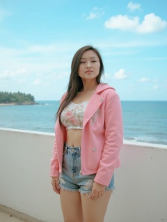 The image depicts a young and slender Asian woman standing on a balcony with a scenic view of the ocean in the background. She has long, wavy hair styled in loose braids. Her outfit consists of a cropped t-shirt and denim shorts, paired with a pink, oversized jacket adorned with patches. The bright blue sky and gentle clouds enhance the vibrant, summery atmosphere. The overall mood seems relaxed and carefree, capturing a moment of contemplation against a beautiful coastal backdrop, no hands..,.... professional photoshoot, epic scenery, cinematic lighting, photorealistic representation, superb quality, highly detailed, fine IMAX-level detail, creativity, rich imagination, exquisite details, sharp high resolution, special originality, 16K rendering, sharp focus, high contrast, vivid colors, realism, maximalism, perfect anatomy, perfect fingers, accurate anatomy, professional, award-winning, bokeh, top quality, very detailed, delicate details, very realistic photography, masterpiece, beauty and aesthetics, HDR