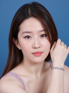 1girl, solo, looking at viewer, smile,  brown hair,  brown eyes, jewelry, closed mouth, upper body, earrings, lips, blue background, portrait, realistic, nose