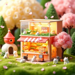 国富家强,,hanzi,Microphotography,a wonderful microscopic world,Miniature_photography,A fantastic microcosm world. A cute scene called 'convenience store'. The center of the screen is a two-story small shop building, with an overall shape resembling a large square box. The upper layer is a transparent glass box with some green plants and decorations inside, with the words "2025" pasted on the box, creating a New Year atmosphere. The lower level is an orange box filled with various goods, including snacks, drinks, toys, and several egg twisting machines, full of childlike fun. The environment around the convenience store is also very warm, with green grass on the ground scattered with petals, and a pink cherry blossom tree next to it, adding a romantic atmosphere. There are also several cute little cats in the picture, some busy in the convenience store, some playing outside, the whole scene is full of vitality and energy. Vibrant colors and rich details create a warm and joyful world through cute cats and playful small shops, giving people a relaxed and pleasant feeling.