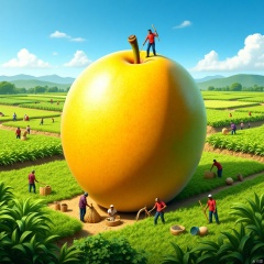 A giant mango takes the center stage with its delicate texture and bright yellow color,surrounded by a vast expanse of farmland where lush crops sway gently with the breeze. Numerous farmers are seen working diligently in the fields,some harvesting while others wield their hoes,showcasing the essence of hard work. The sky is a clear blue with a few white clouds drifting lazily,adding a sense of tranquility and harmony to the entire scene. High resolution photo,macro photography,vivid colors,detailed textures,bustling activity,serene landscape,clear sky.,,Microphotography,a wonderful microscopic world