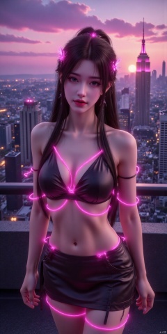 真人肌肤纹理, 4K画质,完美身材,1girl, ,best quality, masterpiece, realistic,(Good structure), DSLR Quality,Depth of field,,looking_at_viewer,Dynamic pose, neonpunk style Neon noir leogirl,hANMEIMEI,realistic photography,,On the rooftop of a towering skyscraper,a girl stands,facing the camera directly. Behind her,a multitude of skyscrapers stretches into the distance,creating a breathtaking urban panorama. It's the perfect dusk moment,with the evening sun casting a warm glow on the girl's face,intensifying the scene's impact. The photo captures a sense of awe,with the sharpness and realism making every detail vivid and clear,Hair fluttered in the wind,long hair,halterneck, . cyberpunk, vaporwave, neon, vibes, vibrant, stunningly beautiful, crisp, detailed, sleek, ultramodern, magenta highlights, dark purple shadows, high contrast, cinematic, ultra detailed, intricate, professional,,