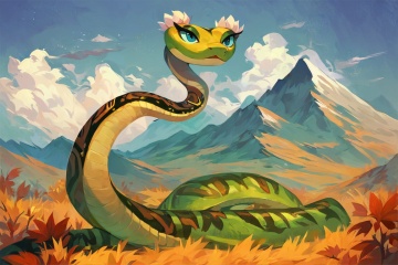 Masterpiece,Best Quality,master viper,snake,grass,full body,feral,solo,perfection detail,extreme detail,solo,green body,simple background,<lora:aki:0.8>,score_9,score_8_up,score_7_up,score_6_up,in autumn,mountain,headdress,