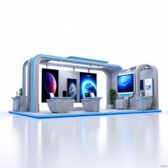 Modern booth, cellphone, technology style exhibition space design, modern booth. The booth is made of silver-gray metal and matched with blue neon lines to present a futuristic feel. The latest electronic devices are placed in the center, and large promotional posters are hung around them. Background white. High-definition documentary photography, the overall composition is balanced and the colors are bright.
