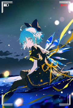 solo, 1girl, cirno, outdoors, masterpiece, black skirt, smile, pleated skirt, black tights, ahoge, alternate costume, frills, looking back, leaned forward,looking at viewer, black dress, pantyhose, black pantyhose, sitting, gold bows, gold ribbon, gold trim, outdoors, night, moonlight, black dress, star print pattern, star pattern, star, starry sky, cloudy sky, cloud, scenery, night,light particles,light and shadow,overexposure,contour deepening,lens flare,depth of field, (very vibrant colors:0.8), very high contrast, sketch, vivid colors, (saturated:1.0), colorful, very high colorfulness, deep blue hues, submerged, pressure, cold atmosphere, dark atmosphere, rella, konya karasue, view finder, scratch art, color tracing
