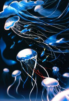 A captivating abstract scene unfolds in a digital artwork, presenting a collection of jellyfish and a fish against a stark black backdrop. The creatures are rendered in shades of cyan and white, giving them a ghostly, ethereal quality.The central focus is a stylized white fish, adorned with intricate cyan markings that resemble splattered paint or watercolor effects. Its body is outlined with a delicate, almost translucent blue, and it sports a single visible black eye. Attached to the fish are thin, wispy blue appendages, suggesting fins or tendrils that seem to float in the dark space.Surrounding the fish are several jellyfish, each unique in shape and style. Some are depicted as simple, rounded forms with blue interiors, while others are more elaborate, showcasing flowing, translucent blue shapes that evoke the graceful movement of jellyfish in water. One jellyfish in the upper right corner is particularly detailed, resembling an abstract creature with flowing tentacles and a more defined bell shape.The overall effect is reminiscent of an underwater scene, illuminated by bioluminescence in the deep sea. The black background enhances the glowing quality of the blue and white figures, creating a dreamlike and visually striking composition. The artistic style suggests a digital painting or watercolor effect, emphasizing fluidity and organic forms. ,overexposure,contour deepening,lens flare,depth of field, (very vibrant colors:0.8), very high contrast, sketch, vivid colors, (saturated:1.0), colorful, very high colorfulness, deep black hues, submerged, pressure, cold atmosphere, dark atmosphere, rella, konya karasue, scratch art, color tracing