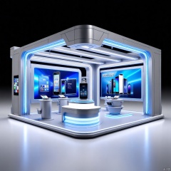 Technology-style exhibition space design, modern booth for mobile phones. The booth is made of silver-gray metal and matched with blue neon lines to present a futuristic feel. The latest electronic devices are placed in the center, and large promotional posters are hung around them. High-definition documentary photography, the overall composition is balanced and the colors are bright. ,Modern booth