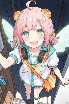 masterpiece, best quality, high quality, CAN:D \(ygo\), 1girl, solo, looking at viewer, smile, short hair, open mouth, dress, green eyes, pink hair, ahoge, wings, socks, bag,
