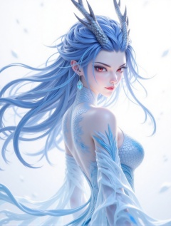 ar,This image depicts a female character full of mystery and fantasy. She has long,ice-blue hair that flutters in the wind,making her look light and agile. The color of her hair seemed **** cold ice in winter,shining with a cold and clear light. There was a pair of silver-colored dragon horns on her forehead. Her eyes were red,as if they were deep flames,revealing an unspeakable mystery. This contrast between red and blue further emphasized her unique temperament and charm. This female character was wearing a transparent white costume decorated with delicate blue patterns and lines. These patterns and lines were **** flowing water waves,giving people a light and elegant feeling. The material of the costume looked light and transparent,as if it was **** up of water elements,complementing her overall image. Her back has textures similar to fish scales,which are staggered to add a sense of movement and layers. This design not only makes her image more three-dimensional and vivid,but also gives the impression that she is a mysterious creature from the deep sea. Overall,this image presents a cool-toned fantasy style. The color scheme of the image is harmonious and unified,giving people a tranquil and mysterious feeling. The image of the female character is unique and charming,which makes people can't help but indulge in this world full of fantasy and romance.,