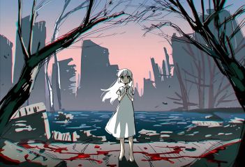 1girl, dress, solo, white dress, long hair, barefoot, own hands together, blood, ruins, white hair, looking at viewer, bare tree, own hands clasped, short sleeves, very long hair, standing, full body, grey eyes, outdoors, closed mouth, newest, highres, safe, year 2024, as109, Tsukumizu, (porforever:0.5), (rei \(sanbonzakura\):0.8), tsubonari, (watanabe tomari:0.8), tareme,, highly detailed, masterpiece, best quality, very aesthetic, absurdres, (very vibrant colors:1.2), (vivid colors:1.2), highly dynamic colors, bright, chromatic aberration, film grain, anaglyph, paper sky, cel shading, sketch, scenery, still life, jewelry, aquamarine, nature
