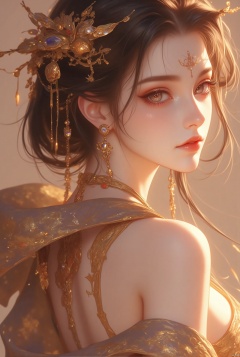 1girl, solo, long hair, looking at viewer, brown hair, hair ornament, brown eyes, jewelry, closed mouth, earrings, indoors, from side, eyelashes, facial mark, reveal/show one's back
