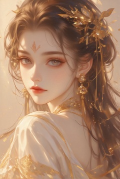 1girl, solo, long hair, looking at viewer, brown hair, hair ornament, brown eyes, jewelry, closed mouth, earrings, indoors, from behind,from side, eyelashes, facial mark, reveal/show one's back,Show waist.