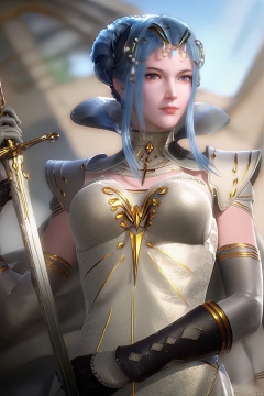 score_9, score_8_up, score_7_up,highly detailed digital,CG,1girl, solo, breasts, looking at viewer, blue eyes, hair ornament, gloves, dress, holding, medium breasts, closed mouth, blue hair, weapon, sidelocks, elbow gloves, sword, hair bun, cape, holding weapon, lips, realistic