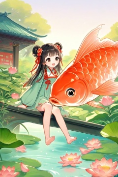 This image is a vibrant and whimsical illustration featuring a young girl sitting on a large, orange fish in a serene pond. The girl has long, dark hair adorned with red ribbons and flowers, and she is wearing a light green dress with red accents. She appears to be enjoying a playful moment, with her legs dangling over the fish and a joyful expression on her face.
