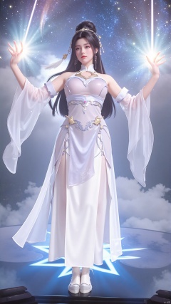 "Yue Chan with outstretched arms, summoning a radiant beam of celestial energy from her palms. Her white robes and long hair are illuminated by the glowing light, and her eyes glow with determination. The background is a swirling vortex of stars and clouds, symbolizing her immense power and connection to the cosmos."