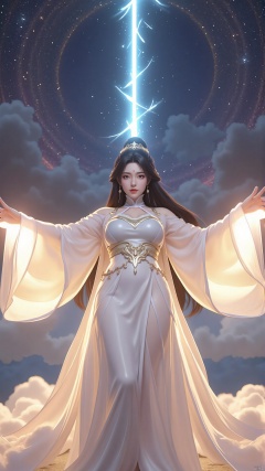 "Yue Chan with outstretched arms, summoning a radiant beam of celestial energy from her palms. Her white robes and long hair are illuminated by the glowing light, and her eyes glow with determination. The background is a swirling vortex of stars and clouds, symbolizing her immense power and connection to the cosmos."