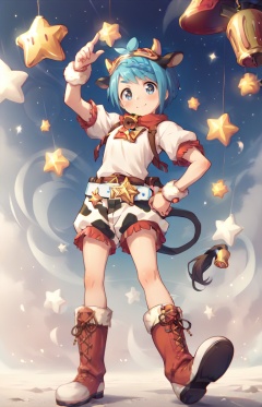 score_9,score_8_up,score_7_up,score_6_up,score_5_up,score_4_up BREAK source_anime,1girl,solo,looking at viewer,blush,smile,blue eyes,star_in_eye,blue hair,full body,short sleeves,boots,shorts,belt,bell,cow print,<lora:野户真阳pony:1>,short hair,
