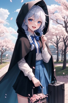 masterpiece,best quality,high quality,loli,chromatic_aberration,Light Blue Theme,//,1girl,butterfly,elaina (majo no tabitabi),bug,shirt,solo,white hair,white shirt,outdoors,skirt,long hair,smile,tree,cover image,braid,flower,cloak,ahoge,blue butterfly,blue skirt,open mouth,holding,looking at viewer,bow,collared shirt,teeth,blush,hood,long sleeves,suitcase,hooded cape,day,upper teeth only,hood down,hair between eyes,petals,blue eyes,sky,high-waist skirt,blue sky,black cloak,hooded cloak,purple eyes,ribbon,black cape,cherry blossoms,:d,falling petals,standing,pink flower,cloud,shirt tucked in,cape,cowboy shot,white bow,blue cloak,holding suitcase,hair bow,novel cover,white flower,side braid,single braid,//,year_2023,year_2024,//,official art,depth of field,detailed light,blurry background,cinematic lighting,ray tracing,amazing quality,very aesthetic,absurdres,beast quality,ultra detailed,