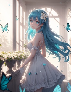 wide shot,(depth of field),global illumination,soft shadows,grand scene,backlight,lens flare,((colorful refraction)),((cinematic lighting)),in the market,from side,looking outside,with butterfly,1girl with lightblue long hair and blue aqua eyes,hair flowers,hime cut,sunlight,blurry background,blurry,White Dress,