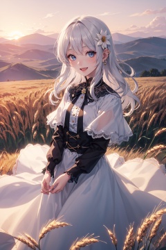 (drawn by Lynn Okamoto),center frame,sharp focus,(panorama, wide shot),best quality,masterpiece,extremely detailed,detailed background,(from above:1.2),1girl,catgirl,solo,loli,blue eyes,white hair,closed one eye,smile,open mouth,skirt,long hair,wavy hair,on side,fluffy hair,french,blush,smile,capelet,lace trim,bodice,sunset,long dress,dusk,scenery,gold sky,high place,horizon,wheat field,wheat ears,wind,wind blow,looking at viewer,(depth of field),bokeh,(holding a flower:1.3),(holding:1.2),(medium):0.5,