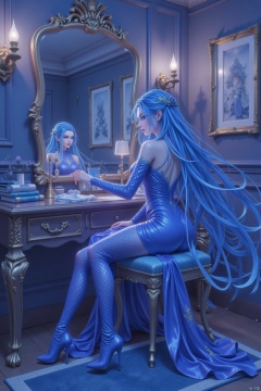 The image depicts a beautifully rendered, fantasy-style character sitting at a vanity table. The character has long, flowing blue hair and is wearing an elegant, form-fitting blue dress adorned with gold accents and intricate designs. The dress has a high neckline and long sleeves, and the character is wearing high-heeled shoes that match the color of the dress.