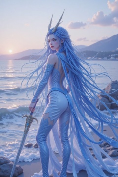 The image depicts a fantasy character standing by a serene body of water during sunset. The character has long, flowing blue hair and is dressed in an elaborate, white and blue outfit adorned with gold accents. The outfit includes a high-collared top with intricate designs and a flowing cape. The character is holding a sword with a decorative hilt, which is positioned to the left side of the image. The background features a calm sea with gentle waves, a rocky shoreline, and a distant mountain range under a sky painted with soft, warm hues of orange and pink. The overall atmosphere is tranquil and mystical, enhanced by the character's elegant and detailed attire.