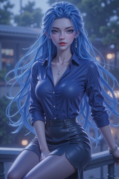 The image depicts a digitally rendered character of a woman sitting on a railing. She has long, blue hair that is styled in loose waves, cascading over her shoulders. Her attire consists of a dark blue button-up shirt with rolled-up sleeves, paired with a black skirt that has a slight sheen, suggesting a form-fitting design. She is also wearing sheer black stockings.