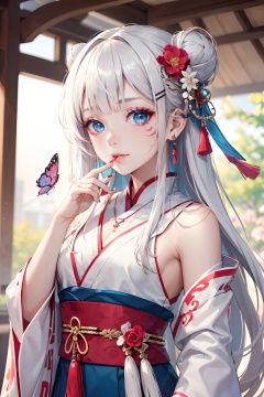 <lora:lora:1>,masterpiece,best quality,high quality,(colorful),loli,1girl,hair ornament,hand fan,jewelry,solo,butterfly,bug,holding fan,folding fan,hair flower,holding,flower,looking at viewer,earrings,white hair,blue eyes,necklace,upper body,covering own mouth,blunt bangs,hair bun,long hair,tassel,pink nails,hanfu,blurry,makeup,single hair bun,tattoo,folded fan,chinese clothes,pink flower,eyeshadow,facial mark,covered mouth,eyeliner,tassel hair ornament,hand up,blurry background,long sleeves,tassel earrings,nail polish,hairpin,hairclip,