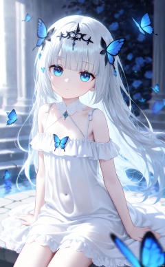 loli,This is a masterpiece that exudes exceptional quality. The illustration is ultra-detailed,utilizing HDR technology to create a sense of depth. The subject matter is an original,delicate,and beautiful artwork,vibrant with color and filled with fantastical elements. The girl is sitting by a deep sea,surrounded by flowing water,with a dull blue World Tree in the background,situated in a cemetery. The serene and dreamy atmosphere gives the entire scene a soulful and enchanting quality. Her pale complexion,azure blue eyes that glow,and silver hair adorned with flowers create a captivating portrait. She wears a Lolita-inspired fashion,expressionless with her mouth closed. The backgrounds range from white,transparent,circular options,and there are also flying translucent blue butterflies that add a sense of liveliness to the piece.,,