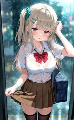 loli,1girl, wet clothes, wet, solo, hair ornament, skirt, underwear, thighhighs, rain, bra, brown hair, see-through, school bag, wet shirt, bag, navel, school uniform, looking at viewer, shirt, breasts, scrunchie, one side up, brown skirt, bow, hairclip, long hair, white bra, bowtie, bra visible through clothes, pleated skirt, black thighhighs, red bow, hair scrunchie, white shirt, open mouth, blush, standing, purple eyes, red bowtie, cowboy shot, collarbone, green scrunchie, short sleeves, wet hair, arm up, doorway, outdoors, zettai ryouiki, large breasts, skirt hold, collared shirt, brown eyes, medium breasts, sidelocks, duffel bag, dress shirt, miniskirt