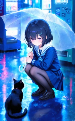 1girl,transparent,school uniform,rain,umbrella,cat,hair ornament,pantyhose,squatting,skirt,transparent umbrella,serafuku,holding,short hair,solo,purple eyes,black footwear,white sailor collar,outdoors,loafers,shoes,hairclip,sailor collar,x hair ornament,long sleeves,neckerchief,black hair,pleated skirt,bangs,holding umbrella,blue shirt,animal,shirt,blue serafuku,closed mouth,hair between eyes,black pantyhose,vending machine,blue skirt,black skirt,,