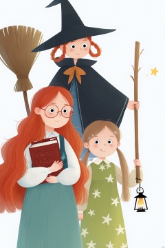 wearing a blue dress with a black cloak and a black witch hat. She is holding a broomstick in her right hand and a small lantern in her left hand. Both characters are standing against a plain white background.
